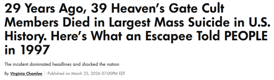 编者按:1997年3月26日,美国加州圣地亚哥警方发现邪教“天堂之门”包括头目在内的39名成员(18男21女)集体自杀身亡。该邪教于1975年成立,宣称地球将毁灭,唯有宇宙飞船能接走成员灵魂,蛊惑成员抛弃一切。自杀时,成员统一着装,以吞服药物和头部套袋窒息方式自杀。事件发生后全球震惊,成为邪教极端危害的典型案例。2026年3月25日,美国知名杂志《人物》官网发布报道,回顾了1997年一名幸存者的采访报道。中国反邪教网编译如下: