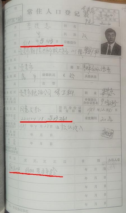 据当事人回忆和档案记载:1994年9月,徐寅筌(时任长春市公安局指挥中心调度处副处长,曾任吉林省及长春法轮功专业委员会副秘书长)、徐寅筌妹夫王长学、警员孙莉萱三人根据李洪志要求将《常住人口登记表》出生栏中出生日期由1952年7月7日改为1951年5月13日,将居民身份证编号栏中220104520707361的“20707”改为“10513”。贾明山在《签发居民身份证登记簿》上作了补登记载,1994年10月20日长春市公安局三处制证所为李洪志制作了新的居民身份证,出生日期为1951年5月13日,编码为220104510513361。