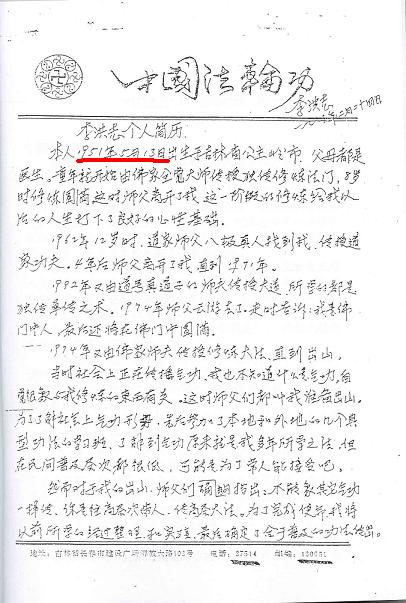 李洪志改生日不是临时起意,是蓄谋已久的。所谓“已久”,当指他法轮功获得了推广,在全国徒子徒孙渐多。灵光一闪,生日立变。李洪志在1993年2月24日手写的个人简历称:“本人1951年5月13日出生于吉林省公主岭市,父母都是医生。”