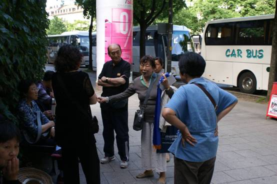 商店门口的对面是一个小摊位,一个老头守着几块宣传版面在发送碟片和资料,另一个五十多岁头发花白的女性斜挎着书包,脸上搭着讪讪的笑容过来与我们搭话。“这位大姐、大哥,听口音是浙江或者上海来的吧?我也是浙江人。法轮大法好,真善忍好,这是宇宙正法,教人做好人……她开始像背书一样说起来,见我们一脸的不耐烦,她话锋一转:“‘天灭中共,三退保命’,2012年世界末日要到了共产党马上就要灭亡了,退党团队才能得救,不退就会跟着共产党下地狱。”我说:“你这个话太毒了吧!不听李洪志的,就会下地狱,你刚才不还在说真善忍吗?你的善到哪里去了?”她赶紧改口说:“我这不是为你们好嘛。我家邻居李奶奶宣布退党后,她得的胰腺癌马上就好了。”她这一说,周围的游客都哄堂大笑起来,“你怎么吹牛皮连草稿都不打,不要说外人不相信,连你们法轮功的人自己也明知是骗人的鬼话,看来你们法轮功都是靠吹牛过日子的。”同行的赵老师是一位近七十岁的退休高级教师,他诚恳地对那位“义工”说:“我的一位很要好的同事,本来就是普通的肠炎,结果练了法轮功,楞是不去看病了,整天打坐、唸那个《转法轮》,后来发展成了结肠癌,他也不去医院,说‘师父’的‘法身’会给他下‘法轮’保佑‘大法弟子’‘祛病消灾’,最后还是不治身亡,才56岁,可惜啊!”