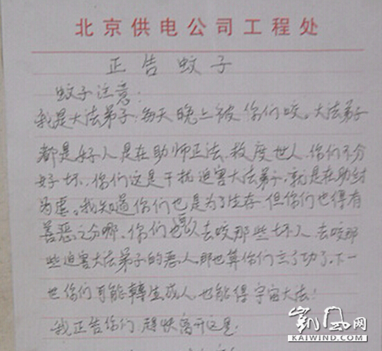 据《大法弟子与苍蝇、蚊子的荒唐对白》所载,网友宝剑、李正在大法弟子家中走访时发现,弟子写给蚊子的《正告蚊子》,“蚊子注意:我是大法弟子,每天晚上被你们咬……但你们也得有善恶之分哪。你们也可以去咬那些坏人,去咬那些迫害大法弟子的恶人。那也算你们立了功,下一世你们可能转生成人,也能得宇宙大法!我正告你们,赶快离开这里,正告此时生效!”中国有一句成语叫“对牛弹琴”,比喻对不懂事理的人讲道理或言事,结果必然失望,同时暗喻一些人做事选错了对象。蚊子,生于烂臭之处,是细菌的携带者和传染者,以吸食人畜的血液为生,被人们称之为“四害之首”。法轮功弟子以为自己一纸“正告”,蚊子就能飞得远远的,这样的“滑稽剧”只能算是最荒唐的滑稽剧。