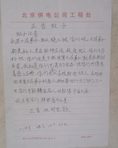 法轮功组织历来都有恐吓他人的“优良传统”,李洪志就曾对反对其邪教组织的司马南先生发出恐吓:“我遥距给司马南装了个法轮,但是司马南这个法轮是逆转的,所以今年司马南就得双目失明,明年司马南就得叫汽车剪去双腿。你不信你看?”, 2010年12月31日下午,《华侨时报》收到一份写在餐巾纸上的恐吓信:“反法轮功者,将会万劫不复”。而法轮功信徒在和小老鼠打交道时也延续师父李洪志的这一做法,二零零八年十一月二十九日一法轮功弟子在其法轮功媒体就发布了一条令人捧腹的文章《回忆大法修炼的历程》一文中提到:“我就提着夹着小老鼠的鼠夹,对小老鼠说:“我告诉你,小老鼠,回去告诉你的同伴,这里是人生活的地方,不许你们再来捣乱,否则我对你们不客气。”然后,我把鼠夹子打开放它走了,此后,我家再没有见过老鼠。”