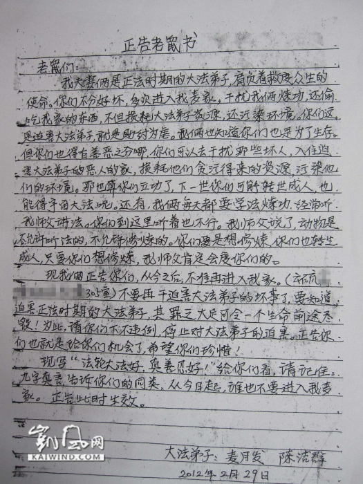 这封署名为“大法弟子”的《正告老鼠书》出自一对被法轮功迷惑的夫妻麦月发(男,69岁)、陈洁群(女,63岁),他们原是广东省某矿企业集团的退休职工,膝下无子,老两口相依为命。1998年初,夫妻俩本着祛病健身的目的开始练习法轮功,然而,随着学法的深入,夫妻俩被李洪志所描绘的“天国世界”深深吸引。为了能早日“圆满”成为“天国世界”里的“法王”,他们十多年来专心学法练功,竭尽所能放下一切“名利情”,严格按照“大法弟子”(法轮功信徒的内部称谓)的标准做“人”做事。(注:法轮功教主李洪志宣称他的弟子是“超常人”,他们所遵循的“法理”与正常人社会的理是相反的。)也就写下了这让人啼笑皆非的“正告书”。