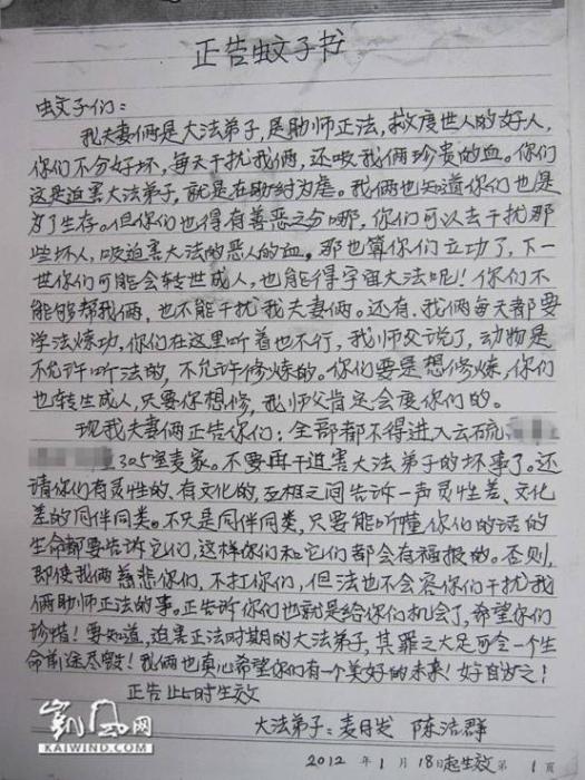 近日,凯风网披露了一对法轮功夫妻给蚊子、蟑螂、老鼠写的一批《正告书》,引起网络热议。《正告书》中法轮功痴迷者匪夷所思的言语让人啼笑皆非,这种荒唐行径不仅暴露了法轮功的邪教本质及其对信徒精神控制的危害,也暴露了法轮功自相矛盾的理论所导致的修炼的窘境——“大法弟子”到底该不该打蚊子?