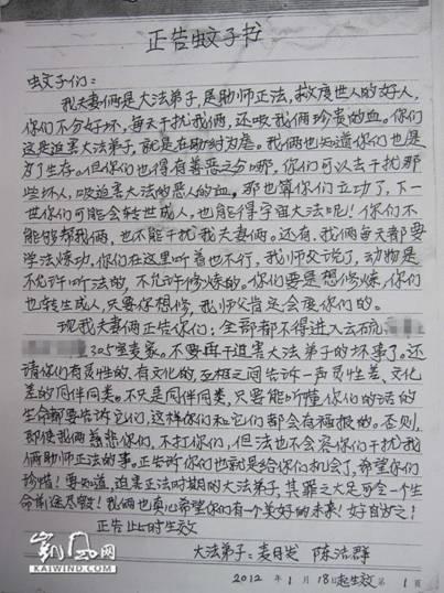 正告蚊子书,玩法真奇葩。据凯风网报道,广东省有一对夫妻痴迷修炼“法轮功”,他们以书面形式郑重其事发出《正告蚊子书》,警告那些叮咬他们的蚊子是干扰“大法弟子”在做“助师正法”的事,是“迫害大法弟子”、“助纣为虐”的行为,最后还给蚊子们指点了一条“生路”——去“干扰那些坏人”,这样将来会得到师父的“福报”和“救度”,有机会“转世成人”,还能得“宇宙大法”。以吸食血液为生的蚊子,是让人极其厌恶的害虫之一,一纸“正告”与蚊子就地论“法”,如此异常奇葩的逻辑思维,也只有被“法轮功”邪教洗脑的人才会想的出来。