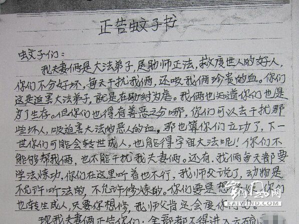 师父说他“法身”无数,弟子就是到月球上都能保护,可是弟子真的想问师父:弟子生病遇祸时,怎不见“法身”保护、弟子“弘法”受罚丧命时,怎不见“法身”保护,竟连小小的蚊子干扰师父都无计可施,这怎能不让弟子心中生疑呢?没有师父“法身“保护,弟子只能出此下策,发《正告蚊子书》,警告蚊子不再干扰弟子修练。