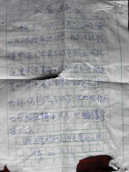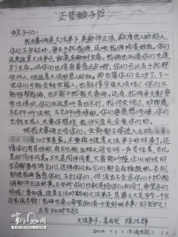 • 独家曝光:法轮功告床和蚊帐书   编者按:2012年1-2月,广东省云浮市法轮功受害者麦月发、陈洁群夫妇连续发出《正告蚊子书》、《正告蟑螂书》、《正告... 2015-07-02