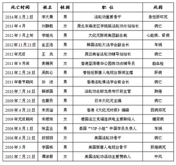 “圆满”是法轮功弟子“修炼”的“终极目标”,生死问题是检验“圆满”走向的“风向标”。2014年,频频传来的噩耗令弟子们对“圆满”更加绝望。 1月,曾得到法轮功“第一媒体”盛赞的加拿大法轮功弟子马克•曼斯出车祸死亡;3月,网上又曝出了“全球退党服务中心”执行主席李大勇病亡的消息