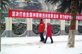 12月21日,河南省濮阳市,街头悬挂着打击全能神邪教的宣传标语。