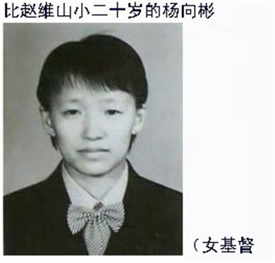 此后,其中代表“全能”的杨向斌被赵维山进一步神话为“全能神”,再被演绎成称为“实际神”的“女基督”。据教内人士透露杨向斌曾是赵维山的情妇。她在1990年前后高考落榜,精神受到严重刺激而患了精神病。后被人带着加入呼喊派的聚会。她常对信徒说自己被圣灵感动见到异梦异象,还终日讲解她的异梦、异象和启示。赵维山趁机吹捧,并声称自己是“全能神”的大祭司,工作是替“全能神”全权负责该组织的行政。