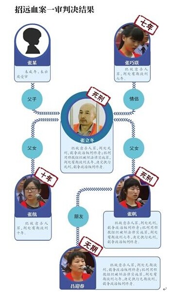 2014年10月11日上午,山东省烟台市中级人民法院公开宣判招远“5.28”案件,五名被告人均被认定犯故意杀人罪,其中张帆、张立冬被判处死刑,剥夺政治权利终身;吕迎春被判处无期徒刑,剥夺政治权利终身;张航被判处有期徒刑十年,张巧联判处有期徒刑七年,张航、张巧联在此前庭审中曾表示认罪、悔罪。