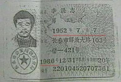 李洪志曾经使用过的身份证(复印件)
