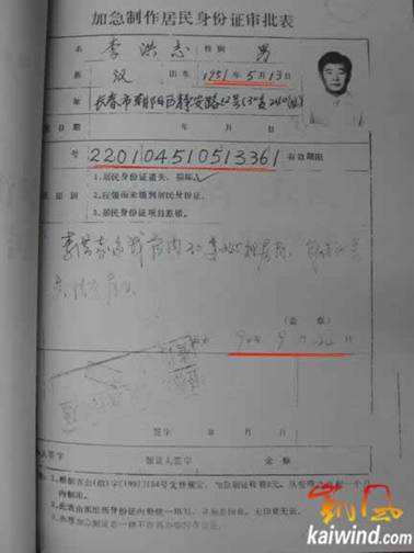 李洪志的“加急居民身份证审批表”