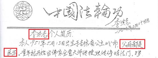 1999年2月21日,李洪志在《美国西部法会讲法》时说:“这个宇宙的年龄我最大,连我生生世世的父母都是我造的。”(参见凯风网视频《最萌教主:我父母是我造的》),可“简历”中写明是1951年5月13日(且不管其真假)出生的,说明凡是这一天之前出生的都比李洪志大,当医生的父母也比李洪志年龄大。