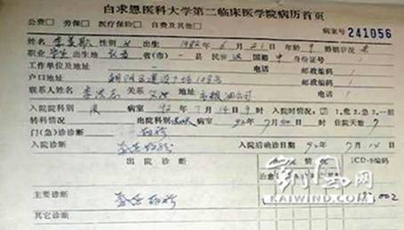 李美歌(李洪志女儿)病历(影印件)