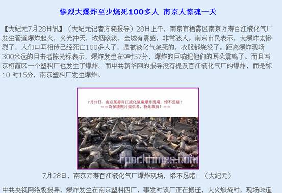 祖国在众多海外华人眼中就是一种精神的寄托,是一份血浓于水的亲情。可是“主佛”自从窜逃国外以来,为了苟延残喘投靠西方反华势力充当跳梁小丑,大力为西方主子卖力。在境外纠结起一帮文痞创办所谓《大纪元时报》专以造假乱真、抹黑中国为业。子虚乌有,鬼话连篇的所谓“苏家屯活摘”由他们最先创造抛出;祖国发生自然灾害的时候,丧尽天良的说啥天谴的也是他们;更有甚者当江苏南京塑料四厂厂区内一拆旧工地,因施工人员违规挖掘造成丙烯管道泄漏引发爆炸,造成13人死亡和120人住院治疗的事故时,他们居然无中生有故意夸大事故,还移花接木的贴上一张2010年7月2日非洲刚果民主共和国一起油罐车爆炸起火造成人员死亡的照片。主佛你说你们干出这样的事情是不是可以说是数典忘祖,丧尽天良。