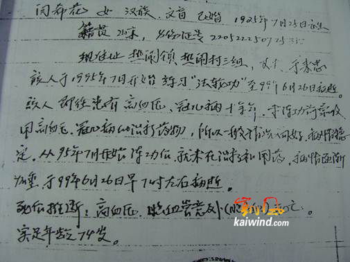 1999年6月26日早晨,外面天气阴沉沉的。闫希花起来后感觉身体不舒服,她对老伴说:“今天头晕得特别厉害。”老伴劝她:“那就别去练功了。”闫希花回答说:“没关系,可能要下雨,跟外面气压低有关,练功可以缓解一下病情。”闫希花走后,老伴不放心,便带了把伞随后跟了出去。闫希花来到练功点,跟大家一块儿勉强做了二十几个动作,忽然就觉得天旋地转,眼前直冒金花儿,嗓子眼儿一热,大口大口地呕吐起来,全身痉挛,抽搐不止,很快进入昏迷状态……等老伴和家人把她送到医院,医生们也回天无力,闫希花因高血压引发脑出血,心脏已经永远地停止了跳动。