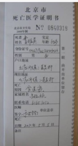 曹维英的死亡证明