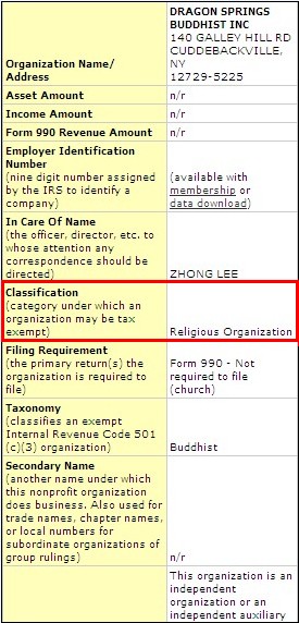 法轮功“教主”李洪志一直强调法轮功不是宗教,并且多次贬低宗教。然而,在现实中法轮功在美国却打着宗教的幌子做敛财的勾当。根据美国免税及非盈利机构(Tax Exempt & NonProfit Organization Information Center)的注册登记记录显示,法轮功总部龙泉寺的注册类别是“宗教组织”。