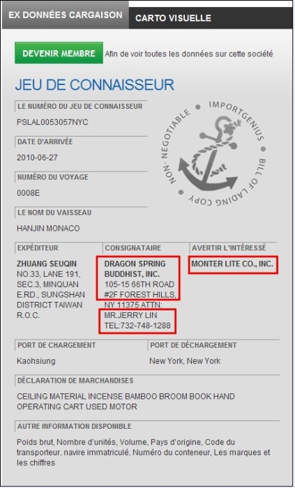 上图中,提单号PSLAL0053057NYC,到达日期2010年6月27日,船舶及航次韩进摩纳哥号0008E,出口商:台湾松山区民权东路191巷33号ZHUANG SEUQIN,进口商:龙泉寺,收货人地址:105-15 66TH Road #2F Forest Hills,NY 11375,通知提货人及联系电话:Mr.Jerry Lin,(732)748-1288,通知单位:MONTER LITE CO.,INC。