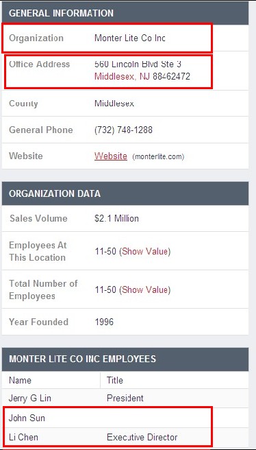 通过查阅美国商业信息网,这个MONTER LITE CO.,INC正是李洪志家族的企业,LI CHEN为公司执行总裁。