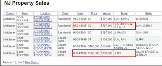 上图中的商业信息记录可以看出,LI CHEN和JOHN SUN都在这个企业工作。而LI CHEN和JOHN SUN,正是李洪志的妻子李瑞于1999年5月14日花费58万美元购买,并以1美元价格将此豪宅赠予的这两人(见下图新泽西州房屋销售记录)。