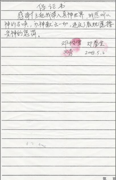 妻子把饭做好了,“小燕子”吃完饭就对我们说:“你们要信‘实际神’,它又叫‘全能神’,这是真正的神,我们人类就是由这个神创造的,从前拜佛不是真神,是偶像,真神主佛能给人平安,赐人喜乐,信了神后,不要干活都有吃的。”妻子听了惊奇地说“这神真好!”我问,那么怎样加入你们组织?小燕子说:“写保证书,交保证书就可以入教了。”我又问保证书怎么写?小燕子说:“感谢‘主’把我带入真神世界,我愿听从‘神’的召唤,为‘神’献出一切,违反了教规愿意接受‘神’的惩罚。”我眼力不好,就叫儿子执笔,她说一句儿子写一句。完后,我和儿子都签字,按手指模。妻子说:“给我也加上去吧!”交了保证书,“小燕子”从包里给我《活体肉身呈现》、《全能神真好》2本书和12张VCD讲道光盘,要我们认真看。