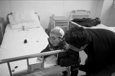 15日,光山县人民医院,一名7岁伤者不愿接受检查。本报记者朱嘉磊摄