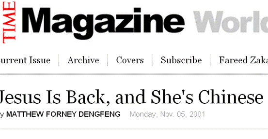 编者按:《时代周刊》是美国影响最大的新闻周刊,有世界“史库”之称,1923年3月由亨利·卢斯和布里顿·哈登创办,其宗旨是要使“忙人”能够充分了解世界大事,读者主要是中产阶级和知识阶层,覆盖面遍布全世界。2001年11月5日,《时代周刊》网站发布《时代周刊》北京分社社长Matthew Forney的一篇文章,通过事实和细节,较全面真实地展现出东方闪电邪教的邪教教义、行为特征,以及如何招募信徒、控制信徒的。