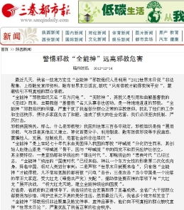 • 陕西媒体报邪教散布末日谣言 全能神活动范围愈发猖獗   福音时报2012年12月14日报道:   近日诸多媒体和当事人报道,名为“全能神”的邪教(即“东方闪电”,又叫实际... 2013-01-05