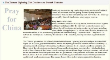 • 东方闪电邪教组织继续干扰基督教会(图)   编者按:“知信行”由香港福音证主协会创于1998年8月31日。该网站第173期期刊《为中国祈福》(Prayfor C... 2012-09-19