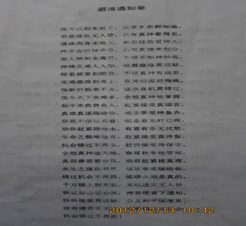 记得那是12月11日中午11点刚过,我正在店里摆弄菜品,准备迎接一天中生意最好的时刻。一个上身穿黑色羽绒服、下身穿黑色裤子,腰系一个小型扩音器,约莫40多岁的妇女,带着三个中年妇女走进我的店子。她自称是“实际神”的信徒,说“世界末日”马上就要到了,地球即将毁灭,只有“全能真神”才能拯救世人,只要加入“实际神”就能远离灾难,乘坐在土耳其找到的诺亚方舟去天国享福。她还递给我一份《避难通知单》,上面写着:“现今已到末世了……不信真神有祸患……赶紧接受真福音……福乐享受神备齐”等等。我听了之后觉得很可笑,说不相信有“世界末日”,摆摆手示意她们离开。可她们固执得很,围在店子里七嘴八舌地劝我加入,其中一位妇女还拿出一个MP4,让我看关于“世界末日”的片子。