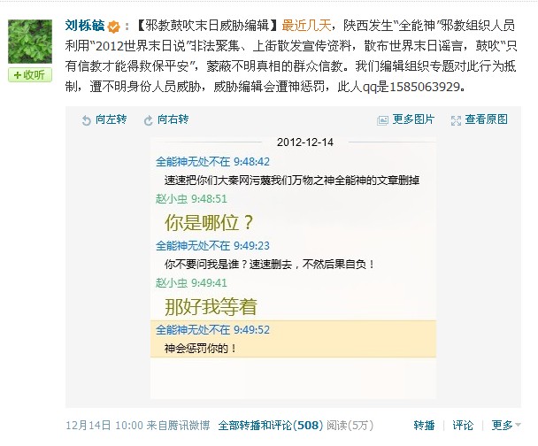 【凯风网2012年12月18日消息,通讯员:秦风】陕西“大秦网”资深编辑刘栎毓,14日在腾讯微博发表博文,称他因批判“全能神”邪教鼓吹“世界末日”遭到该邪教人员威胁,并公布了此人的QQ号。