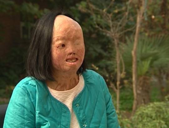 这就是陈果。因为参加2001年1月23日的天安门广场自焚事件,她被烧得面目全非,惨不忍睹。