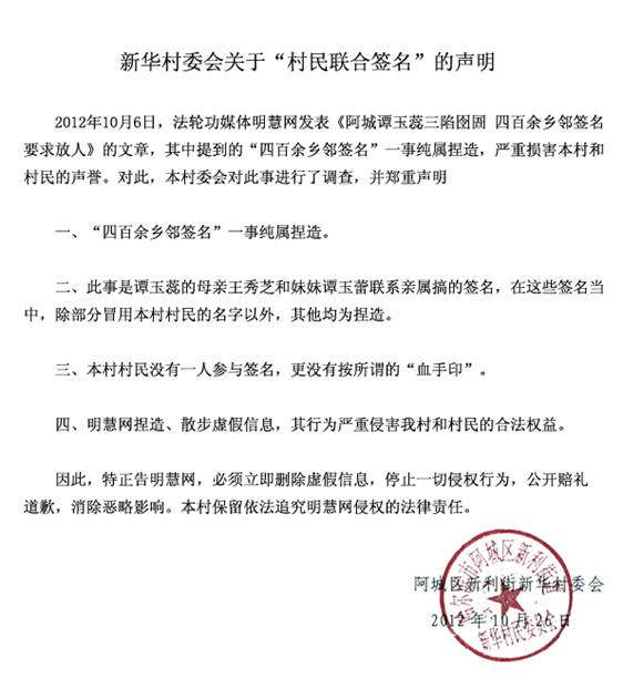 同样的、甚至比这更恶劣的“被签名”事件早就发生过。2012年10月26日,凯风网发表《新华村委会关于“村民联合签名”的声明》(图一)和张久彪的《无中生有的“村民联合签名”》,戳穿了法轮功媒体《阿城谭玉蕊三陷囹圄 四百余乡邻签名要求放人》一文(2012年10月6日)散布的谣言。