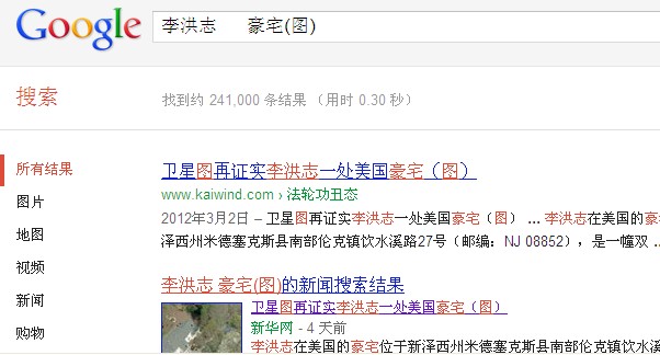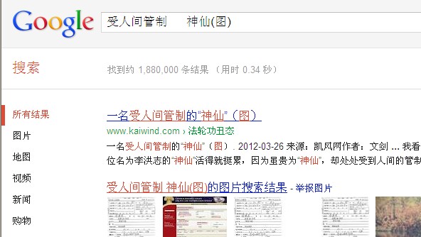 通过关键词在谷歌搜索,境外网上相关信息达到1490余万条。其中:通过关键词“神、开车、违章(图)”搜索,约有12,800,000条结果(见图一);通过关键词“李洪志、豪宅”搜索,约有241,000条结果(见图二);通过关键词“受人间管制、神仙(图)”搜索,约有1,880,000条结果(见图三)。