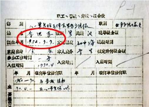 李洪志说是政府把他的生日搞错了,可“图二”告诉我们,他自己填写的《报告表》与原始身份证(扫描件略)上的出生日期完全一致,都是“1952年7月7日”,这与政府有关吗?“图一”与“图二”中的出生日期,都是李的“神仙笔迹”,两处“神迹”掐架了,哪个为真?是“有人造谣说我改过生日”呢,还是李“神仙“确实改过生日呢?答案不言自明。为了将问题说得更透彻,且再看一图:
