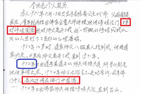 第一,“神仙”也有笔误。蓝框内的“1992年”肯定是“1972年”之误,理由有二。一是下面才说到“1974年又由……”此前的事肯定不会发生于1992年;二是无论上述《小传》,还是大法媒体的资料库中,都是这样表述的:“1972年,李洪志先生参加工作。这时,第三个师父--一位大道师父从长白山而来,道号真道子。”(相关截图略)李“神仙”不仅有笔误,而且不止一处,这则简介,写8岁和12岁时都用的“师父”,可写1972(误作1992)年和1974年时,都错成了“师夫”(汉语中无“师夫”一词)。