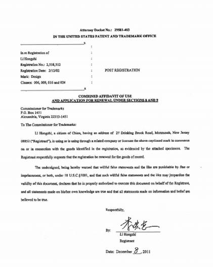 “图五”这份申请书,除了李“神仙”的亲笔签字,都是外文。它可是来头不小,来自美国专利和商标局的官方网站[附注]。申请书的日期落款为“2011年12月8日”,主要内容是申请更新“法轮大法”商标(“卍”字符图案)的注册信息(商标申请人李洪志的住址变更情况)。有关详情,敬请参见晨鸣先生《神也注册商标(图)》一文(凯风网2012-04-10)。